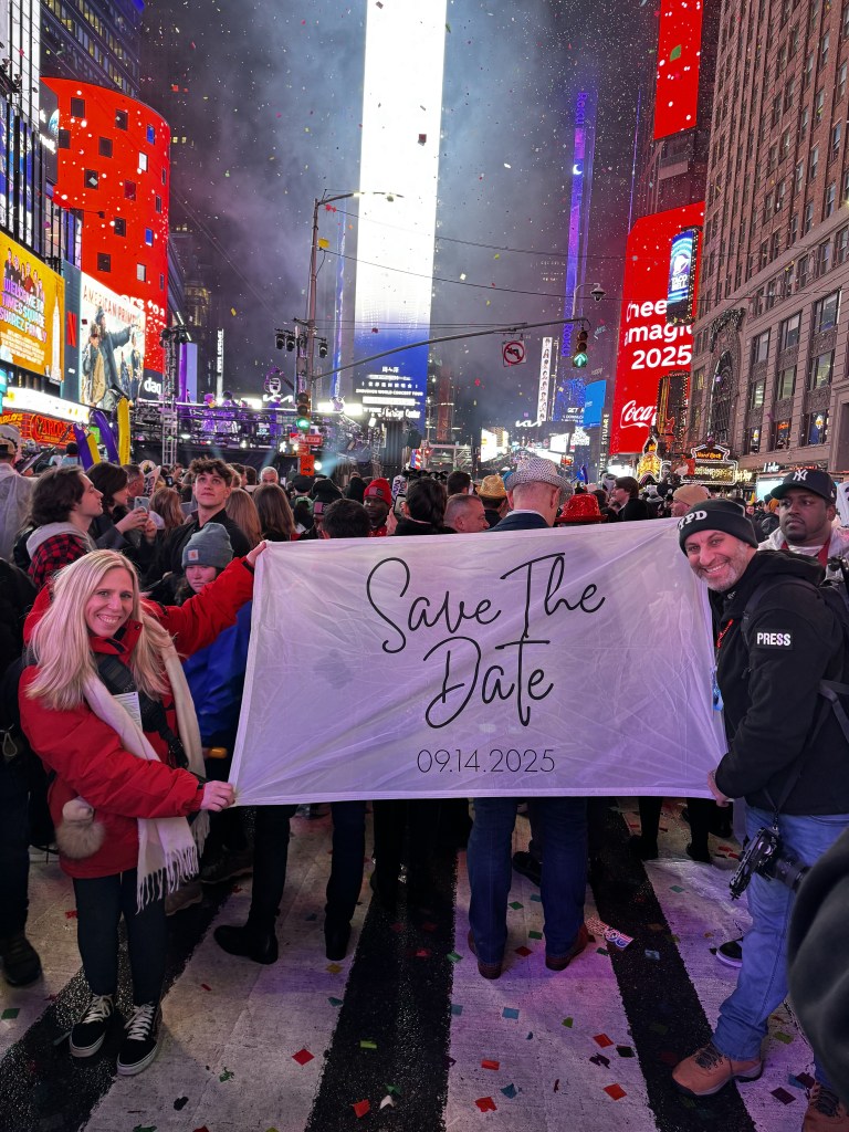 On a personal note, my fiancée and I added our own special twist to the night. As photographers, we couldn’t resist the opportunity to create something meaningful. We brought along a “Save the Date” sign to announce our wedding on September 14, 2025, and captured the moment in the heart of Times Square. The vibrant lights and the energy of the crowd made it the perfect backdrop for a photo we’ll treasure forever.