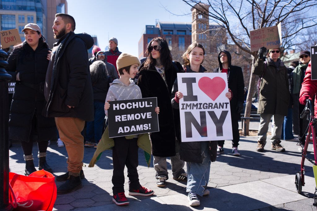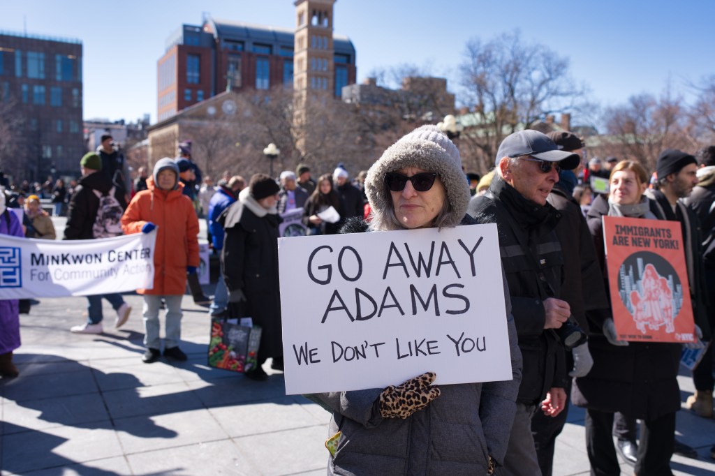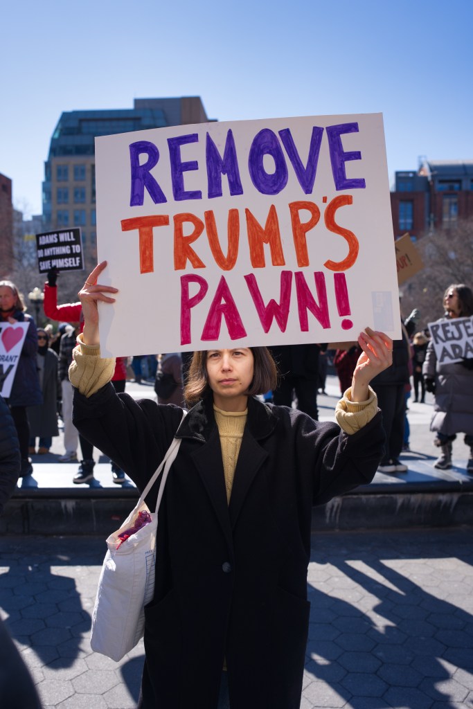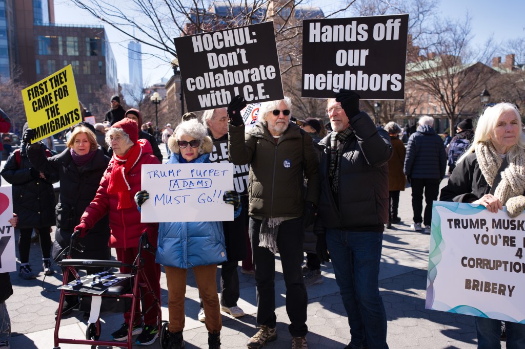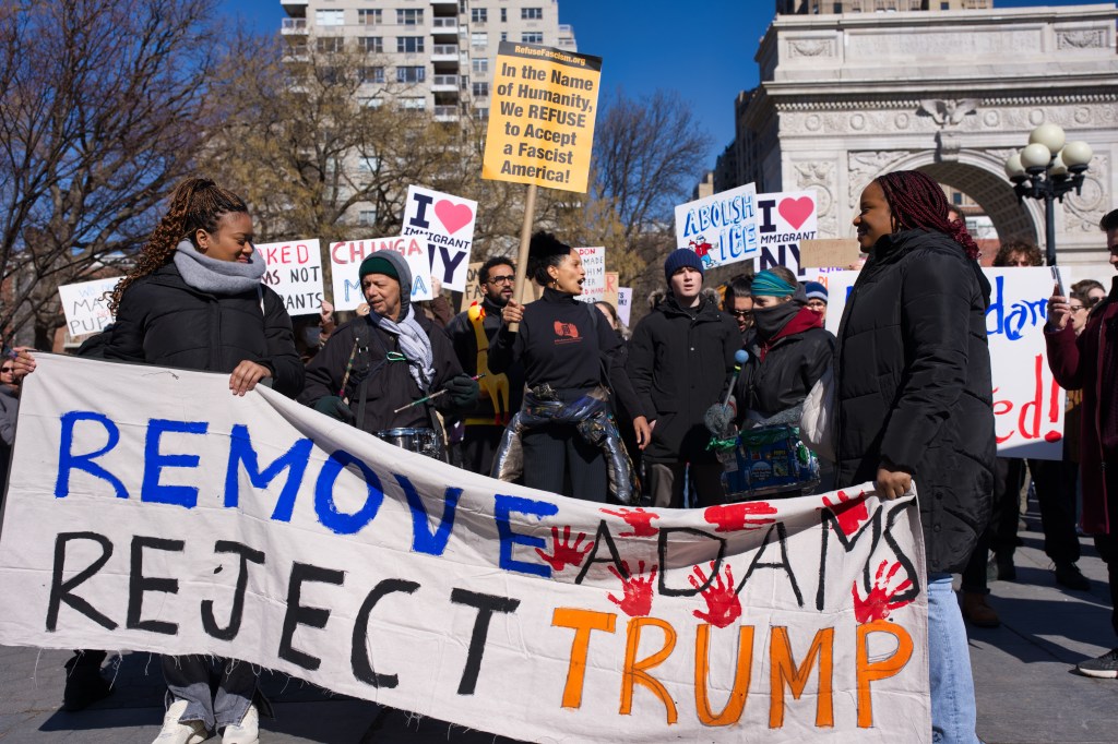 Three women hold a sign that reads “I love Immigrant NY” with a red heart. They are outdoors, smiling, and one makes a peace sign. A man sits in the background.Outdoor daytime photo of a political protest. Several people, including children, hold signs expressing opinions about New York politics and immigration. The setting appears to be an urban street.A protest scene outdoors on a sunny day. A woman holds a sign reading “Go Away Adams We Don’t Like You.” Other protestors hold various signs, with a crowd visible in the background.A political protest unfolds outdoors on a sunny day. Multiple individuals hold signs expressing dissent against Hochul, Adams, and others, citing collaboration with ICE and accusations of corruption.A person holds a sign at a protest in front of Washington Square Arch in New York City. Many other protestors are visible in the background. The sign advocates for unity and action.A woman at a political protest holds a sign reading “Remove Trump’s Pawn!” The sign is multicolored, and she’s wearing a black coat and a yellow sweater. Other protesters are visible in the background.A woman sits on a low wall holding a sign that reads “Adams Must Go!” She is wearing dark clothing and a dark hat. The background includes urban buildings and a church.A person in a green hat and red jacket holds a protest sign that reads “America Seriously? a dictator?”. The sign is painted on a torn white cloth and is being held aloft on a pole in a park setting. A person in a yellow vest is visible in the background.A city street scene depicting a protest march in progress. Numerous people with signs are walking down the street, surrounded by traffic and buildings. The street is lined with parked cars and commercial buildings.A protest demonstration featuring a person holding a hand-painted banner that reads “America Seriously? A Dictator?”. A crowd of people stands behind. The setting appears to be an urban park on a sunny day.Two female reporters interview a man outdoors on a sunny day. A camera crew and other people are visible in the background.