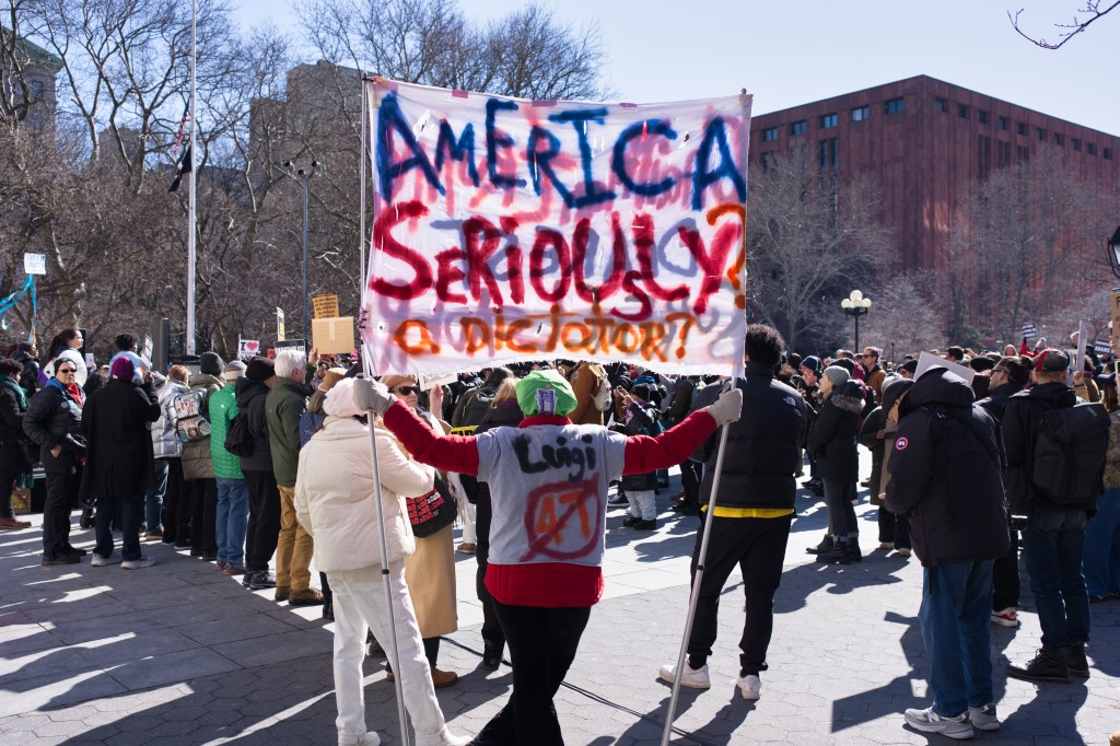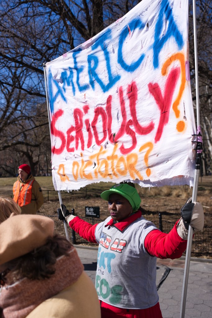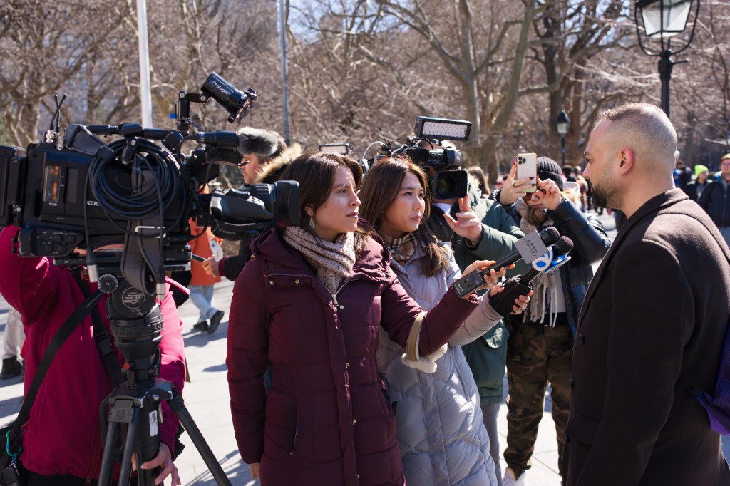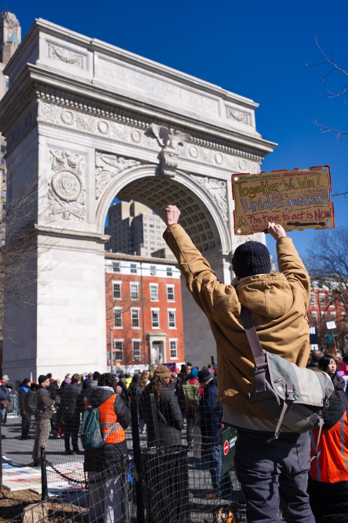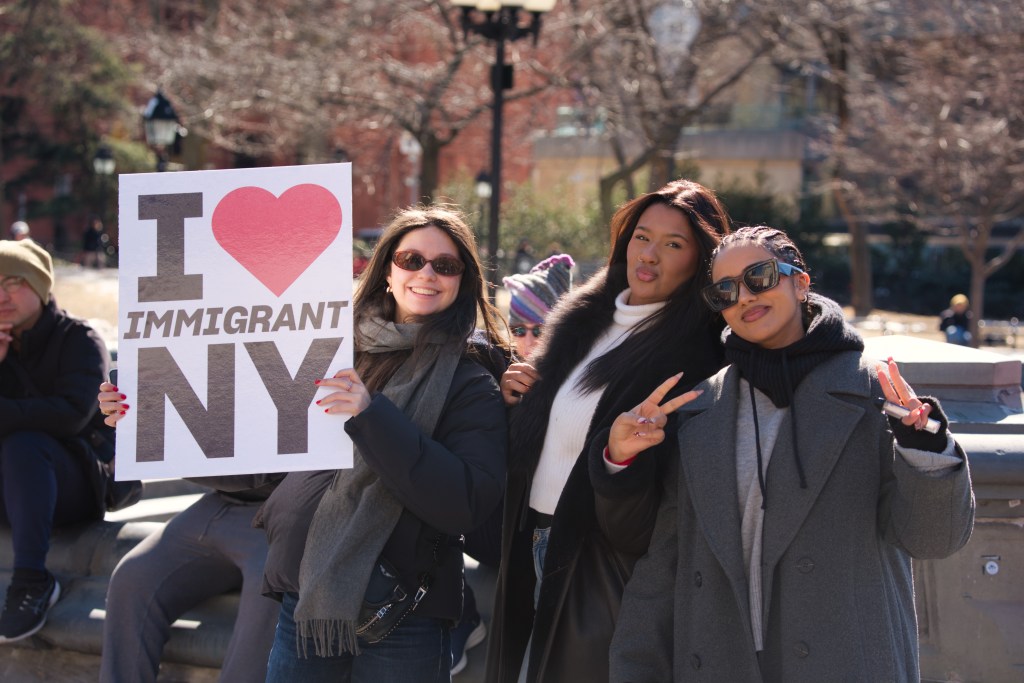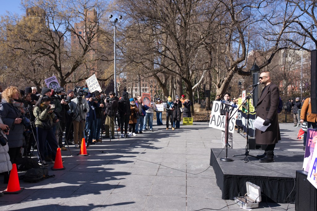 Three women hold a sign that reads “I love Immigrant NY” with a red heart. They are outdoors, smiling, and one makes a peace sign. A man sits in the background.Outdoor daytime photo of a political protest. Several people, including children, hold signs expressing opinions about New York politics and immigration. The setting appears to be an urban street.A protest scene outdoors on a sunny day. A woman holds a sign reading “Go Away Adams We Don’t Like You.” Other protestors hold various signs, with a crowd visible in the background.A political protest unfolds outdoors on a sunny day. Multiple individuals hold signs expressing dissent against Hochul, Adams, and others, citing collaboration with ICE and accusations of corruption.A person holds a sign at a protest in front of Washington Square Arch in New York City. Many other protestors are visible in the background. The sign advocates for unity and action.A woman at a political protest holds a sign reading “Remove Trump’s Pawn!” The sign is multicolored, and she’s wearing a black coat and a yellow sweater. Other protesters are visible in the background.A woman sits on a low wall holding a sign that reads “Adams Must Go!” She is wearing dark clothing and a dark hat. The background includes urban buildings and a church.A person in a green hat and red jacket holds a protest sign that reads “America Seriously? a dictator?”. The sign is painted on a torn white cloth and is being held aloft on a pole in a park setting. A person in a yellow vest is visible in the background.A city street scene depicting a protest march in progress. Numerous people with signs are walking down the street, surrounded by traffic and buildings. The street is lined with parked cars and commercial buildings.A protest demonstration featuring a person holding a hand-painted banner that reads “America Seriously? A Dictator?”. A crowd of people stands behind. The setting appears to be an urban park on a sunny day.Two female reporters interview a man outdoors on a sunny day. A camera crew and other people are visible in the background.