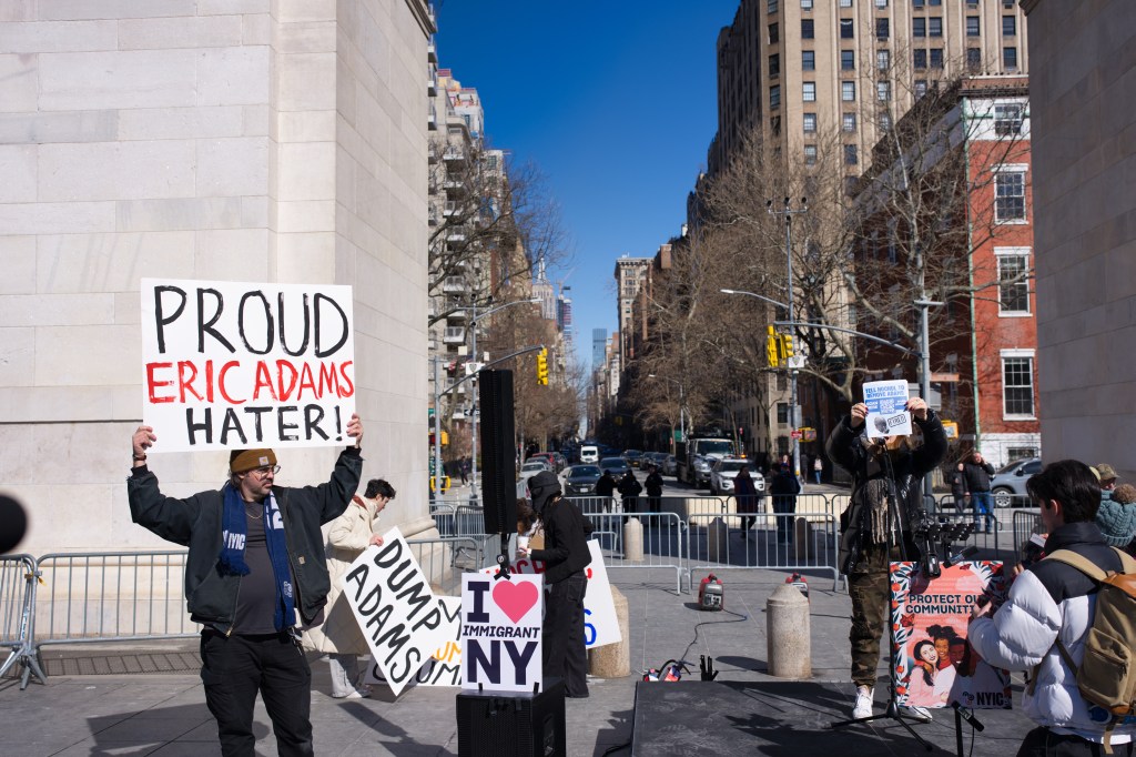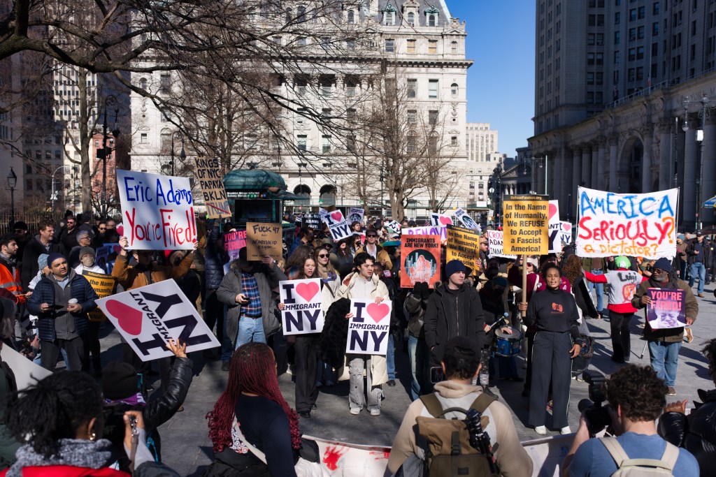 Protestors in NYC demonstrate against Mayor Eric Adams, holding signs expressing disapproval and support for immigrant communities. The demonstration takes place outdoors on a sunny day, near a city building.