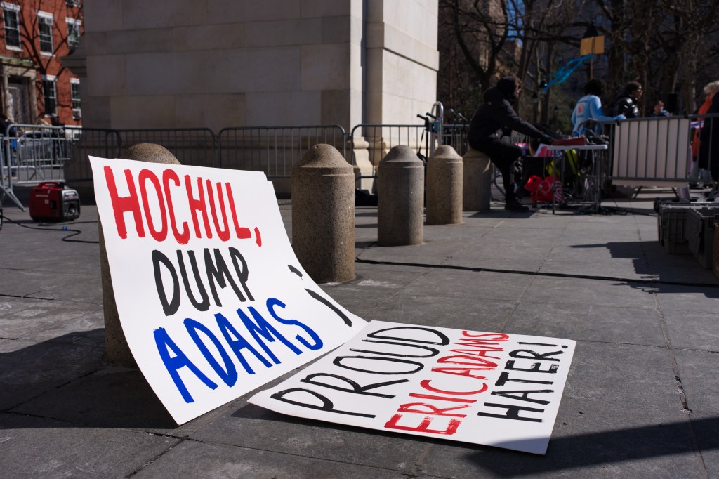 Two protest signs lie on the ground near a building. One sign says “Hochul, Dump Adams” in red, black, and blue. The other says “Proud Eric Adams Hater!” in black and red. Security barriers and a person are visible in the background.