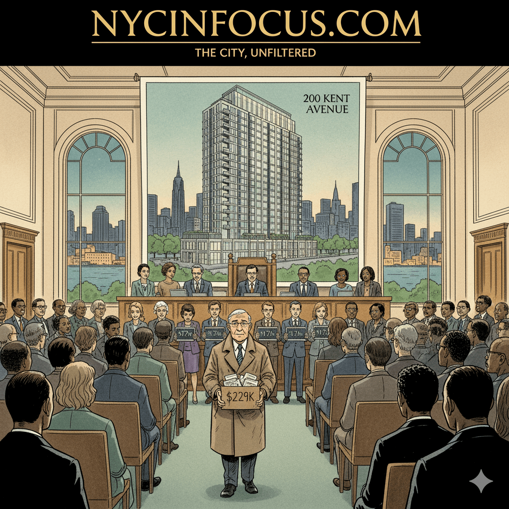 Documents reviewed by NYC In Focus show the Brooklyn Borough President will hold a ULURP hearing at 6:00 p.m. TODAY, Monday, April 13, 2026, on the 200 Kent Avenue rezoning in Williamsburg. The application would convert a 5-story non-residential building into a 14-story, 143-unit mixed-use tower with 36 permanently affordable units.